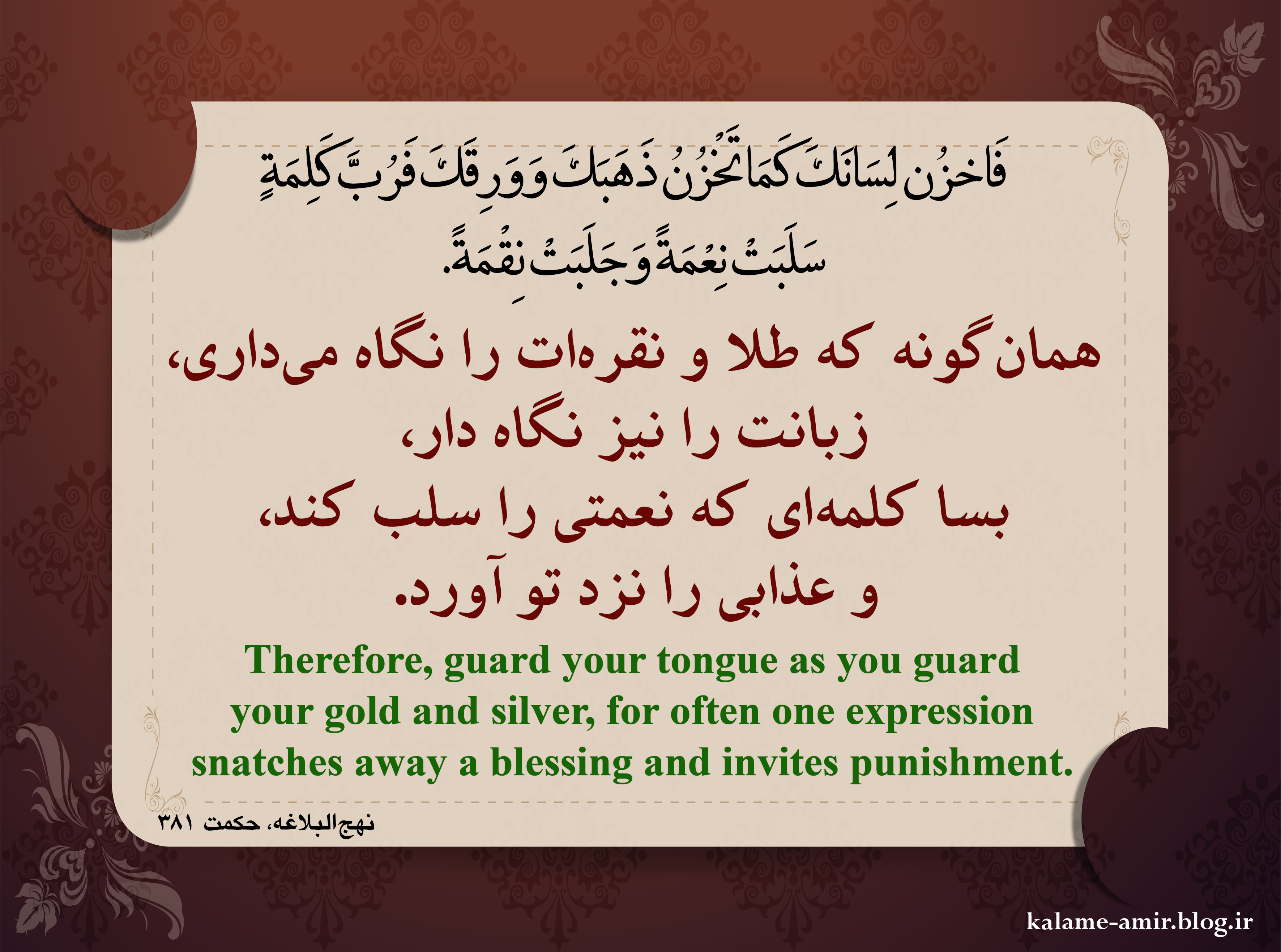 فَاخْزُن لِسَانَکَ کَمَا تَخْزُنُ ذَهَبَکَ وَوَرِقَکَ فَرُبَّ کَلِمَةٍ